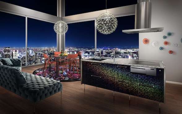 キッチン扉にもこだわり、ダークな木目調の「ブラックオーク グレイン」、虹色にきらめくハイプレッシャーラミネートの「スパークル シャドウ」、見る角度によって変化する3Dビジュアルエフェクトの「サーフェイスホワイト」の3種類のデザインを用意した。