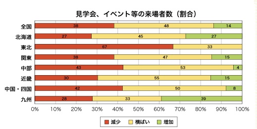 見学会・イベントへの来場者数は、「増加」が前期35%→今期14%に減少、一方「減少」が前期13%→今期38%へと大幅に増加した。消費者の購買意欲についても、「増加」が前期53%→21%へと大幅に減り、「減少」が4%→19%に増加。顧客のうごき、マインドが停滞しているとみる。