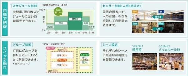 時間帯ごとに自動調光する「スケジュール制御」、周囲の明るさや人の在室を感知して自動調光する「センサー制御」、エリアごとに自動調光する「グループ制御」、シーンごとに最適な照明設定を登録できる「シーン設定」など、各種設定をパッケージ化することで照明設計費用を削減。「LiCONEX」と比べて導入費用を約15%、運用までの工期を約48%短縮する。