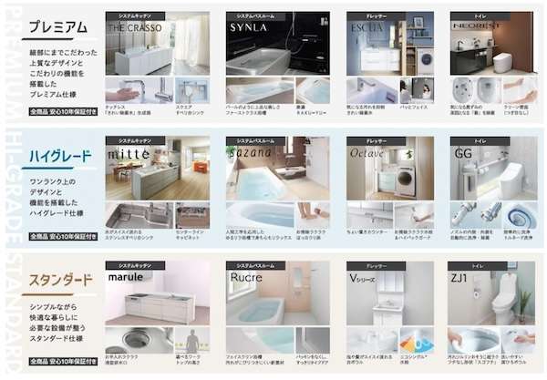 水回りリフォームパッケージは、キッチン、バスルーム、洗面化粧台、トイレ等の水回り設備のリフォームを、プレミアム・ハイグレード・スタンダートの3グレードから組み合わせて選べるパッケージ商品。