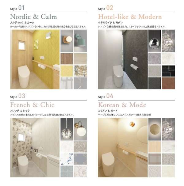 もう1つのトイレインテリアリフォームは、プロのコーディネーターが吟味した4つのインテリアスタイル(ノルディックカーム、ホテルライクモダン、フレンチシック、コリアンモード)から選べるもの。床・壁・天井のほか、ペーパーホルダーやタオルハンガー、照明、収納までトータルの内装デザインを提案する。