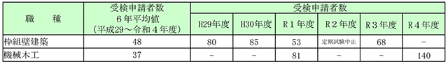 枠組壁建築は、木材の枠組みや合板を組み立て、壁や床、屋根を建築する作業で、1981年に検定職種が新設された。開始当初は年間1000人を超える受検者があったものの、1990年以降に大きく減少。2021年度には68人となり、その後も6年間の平均が50人を下回っている。