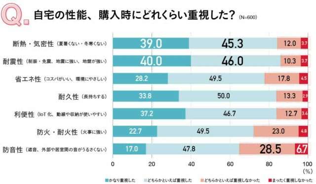 一方で、「どちらかといえば重視しなかった」「まったく重視しなかった」と回答した割合がいずれも高かったのは「防音性」で、合わせると3割を超えた。