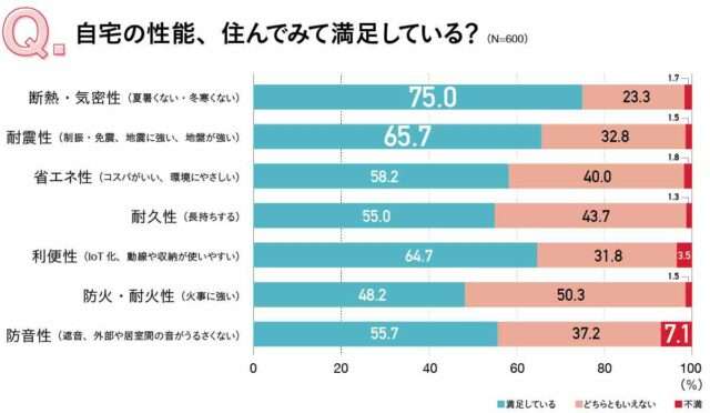 この結果を踏まえつつ、住宅性能に対する住んでからの満足度を尋ねた設問を見てみると、重視していた割合が高かった「断熱・気密性」「耐震性」については、「満足している」の割合が7割前後と高い満足度を示していた。
