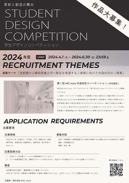 ARC style(アークスタイル、静岡県富士市)は4月1日、「第1回 ARC style 木造住宅コンペティション」の募集を開始した。応募期間は6月30日まで。