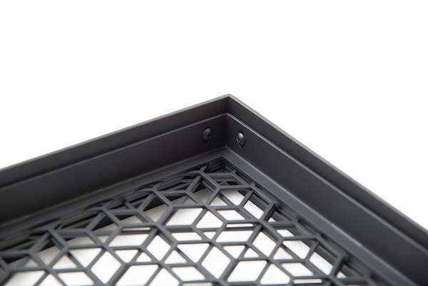 5種類の幾何学模様とガラスの組み合わせで、表現できるデザインの数は771通り。サイズは300×300・600・900・1200mmの4種類。艶消しブラック1色。