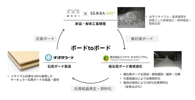 今回、石膏ボードの安定供給および天然資源保全の課題を解決するため、施工事業者(森ビル)、内装業者(船場)、建築資材メーカー(チヨダウーテ)、廃石膏ボードリサイクル会社(トクヤマ・チヨダジプサム)の連携により、水平リサイクルを実施。森ビルの施設開発で発生する廃石膏ボードを、トクヤマ・チヨダジプサムが独自技術で100%再生利用し、新たな石膏ボード(サーキュラー石膏ボード)を製造する。