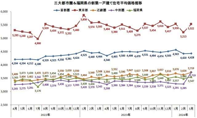 福岡県は3547万円(1.9%増)と反転上昇。戸数は前月の反動から大幅減となった。福岡市は4209万円(2.9%減)と反転下落した。