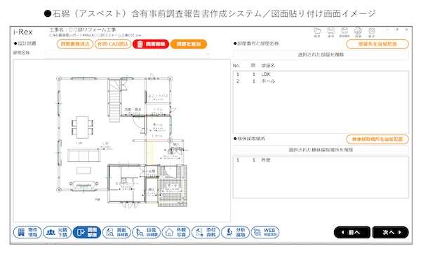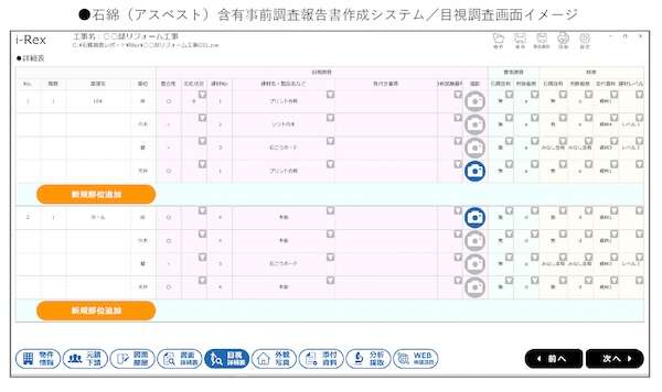 Windowsタブレット端末を使って、書類調査、現場での目視調査をしながら写真撮影や劣化状況判断を行うことで、簡単に石綿含有事前調査報告書を作成できるもの。