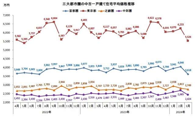 東京カンテイ(東京都品川区)はこのほど、3月の主要都市における中古木造一戸建ての供給動向を発表した。首都圏は反転下落、近畿圏は連続下落、中部圏は下落に転じた。