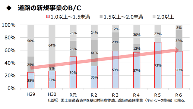 議事では、日本が直面している人口減少と今後の財政のあり方について説明。主要国よりも速いペースで人口減少が進む中、2050年には8割の地域で人口が30%以上減少するとの予測があり、約2割の地域で無居住化する可能性も指摘されている。こうした状況下で、全国のインフラ整備で事業評価(B/C:費用便益分析)が、1.0(※有益である基準)未満となる事業が増加。将来世代を意識した持続可能な社会を作るためには、コンパクトシティ化を前提としてインフラ整備を進め、マクロな視点で国土のグランドデザインを描くことが求められる。