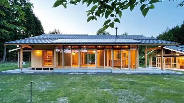 「坂元植林の家 さとのえ」。深い軒の出や縁側など建築的な工夫で自然エネルギーを活用しつつ、太陽光発電や太陽熱温水器など再エネ設備も搭載