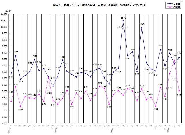 新築マンション価格の推移(首都圏・近畿圏)2021年3月~2024年3月