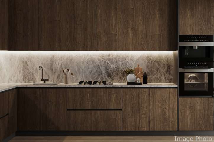エイジングポリッシュはメラミン化粧板にほどこされた表面エンボスの種類で、柔らかな凹凸の中にあるグロスとマットの輝度感と、落ち着いた色柄の融合が特徴となっている。