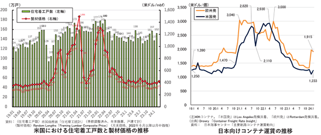 米国材は、米国内で住宅着工数が伸びたことにより、2月上旬に製材品価格が上昇したが、3月中旬には落ち着いた。カナダは伐採期に入り、港頭在庫は平常。産地の製材品価格はほぼ横ばいとなっている。15種平均価格は3月初頭と比べて4.7%の上昇。