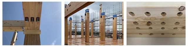 (左)柱、梁(住宅用の構造材3本を組合せてビル用の柱・梁の構造体へ)