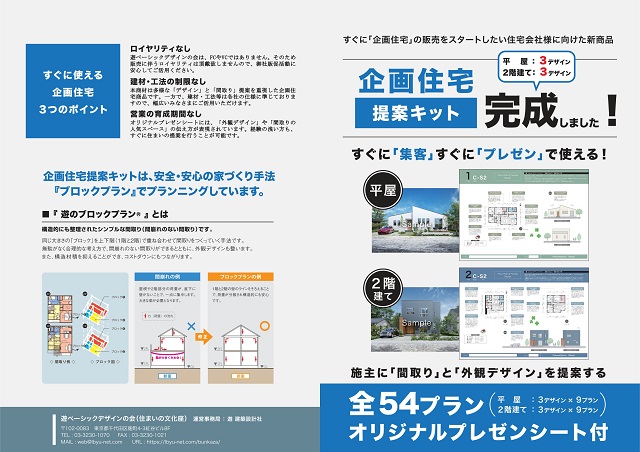 企画住宅の販売にすぐに取り掛かりたい住宅会社向けの新商品で、プラン提案のプレゼンに必要な「外観デザイン」「間取り」「提案シート」をすべて揃えた提案キットとして提供する。