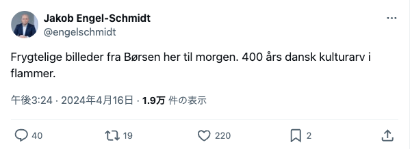 ヤコブ・エンゲルシュミット文化相はX(旧Twitter)に「今朝の証券取引所からの恐ろしい映像。400年の歴史があるデンマークの文化遺産が炎に包まれた」と投稿し、衝撃を露わにした。