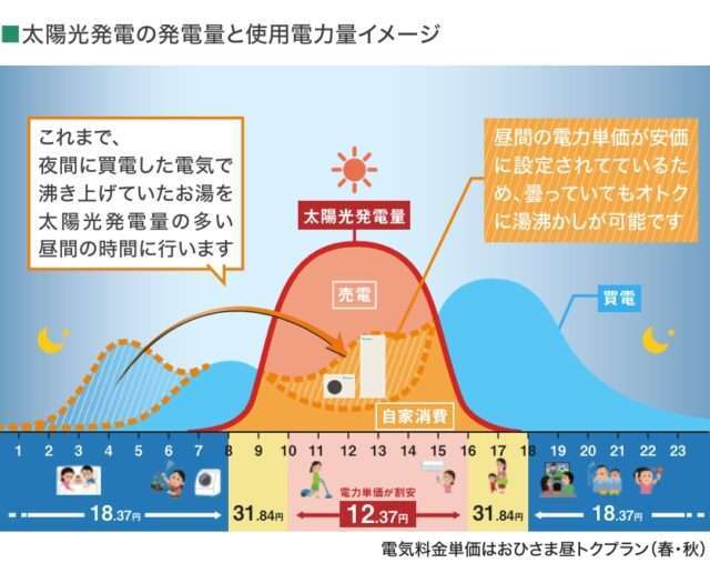 おひさま昼トクプランは、エコキュート、蓄電池、電気自動車を導入している世帯が対象に、太陽光発電の発電量が多い昼間の電力単価を割安に設定する料金体系のプラン。同社は2022年度において、新築住宅の太陽光発電搭載率が97%に達している。また容量も平均8.3kWと大容量化していることから、23年7月1日からおひさまエコキュートを標準化した。