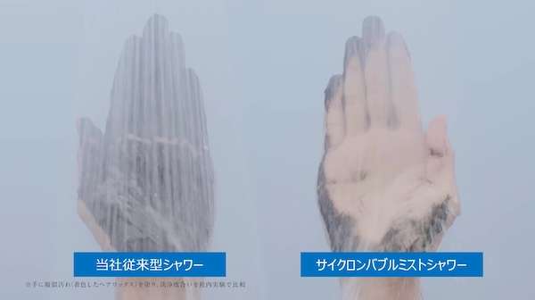 新開発の「サイクロンバブルミスト」の独自水形には、水流1mlあたり約2200万個のウルトラファインバブルを含み、従来品比約2倍の洗浄力を発揮。