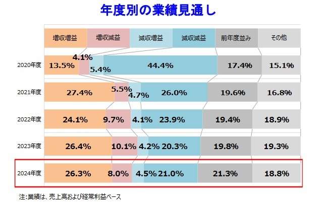 帝国データバンク(東京都港区)は4月23日、2024年度の業績見通しに関する企業の意識調査の結果を公表した。調査対象は全国2万6935社、有効回答企業数は1万1268社(回答率41.8%)。