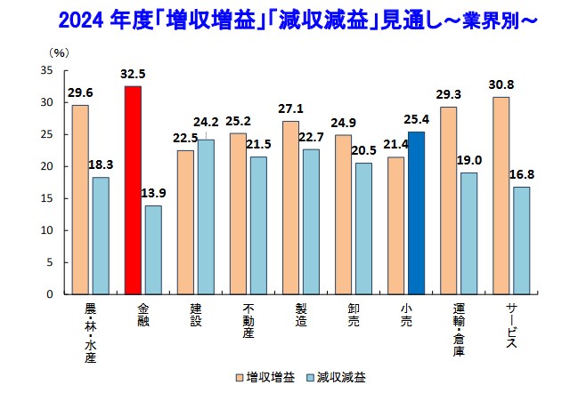 一方「減収減益」は、「小売」(25.4%)が最も高く、次いで「建設」(24.2%)となった。