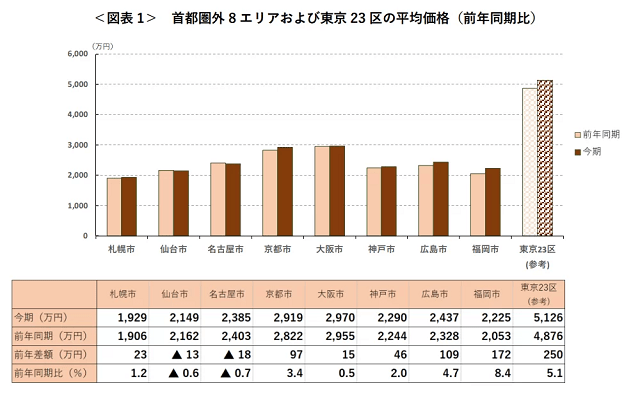 今回から、四半期ごとに首都圏外8エリア(札幌市、仙台市、名古屋市、京都市、大阪市、神戸市、広島市、福岡市)についても公表。1~3月期は、京都市が前期比1.1%減の2919万円と下落。大阪市は2970万円(同0.5%増)、神戸市は2290万円(同2.2%増)、札幌市は1929万円(同1.0%増)、広島市は2437万円(同0.1%増)、福岡市は2225万円(同2.0%増)で、2017年Ⅰ期以降最高額を更新した。