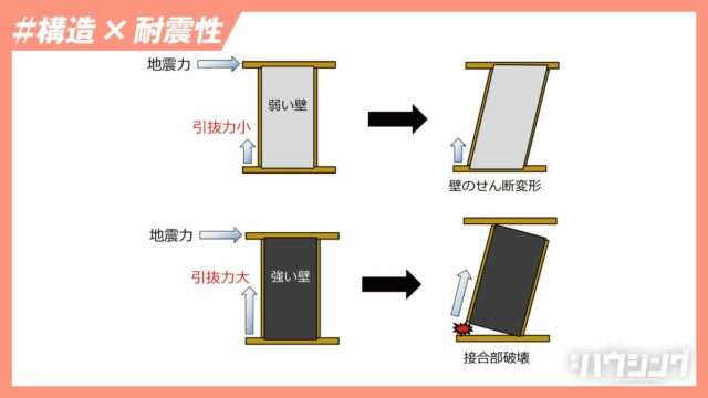 A.高倍率の耐力壁のほうが回転を防ぎやすいが接合部の引き抜きが局所的に強くなるので対策が必要