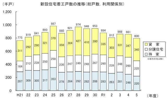 利用関係別では、持家は21万9622戸(同11.5%減)で、1959年度の20万7546戸に次いで低い水準となった。物価上昇と消費者マインドの低下が影響したと見られる。貸家は34万395戸(同2.0%減)で、3年ぶりに減少した。
