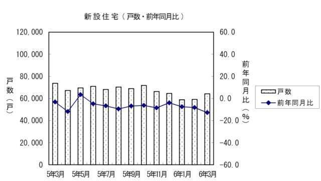 貸家は2万8204戸(同13.4%減)で再び減少。分譲住宅はマンション(同21.1%減)、一戸建(同12.7%減)ともに減少が続き、全体では3カ月連続で減少。1万9189戸(同16.8%減)となった。