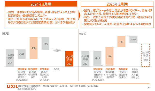 国内事業は、補助金効果により窓リフォーム向け商品の売上が伸長したものの、新築着工件数の減少が響き、持家・分譲ともに売上が減少。コスト面でも、資材・部品価格の上昇を販売価格改定で十分カバーできず減益となった。海外事業は、金利の高止まりや需要低迷により大幅な減益に。為替による影響が125億円に膨らんだ。さらに予定よりも早期に着手した構造改革にかかる費用も加わり、最終利益を押し下げた。