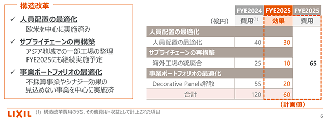 海外事業の構造改革については、24年3期では人員配置の最適化、サプライチェーンの再構築、事業ポートフォリオの最適化に120億円を投じたが、25年3月期では第1四半期に最終となる65億円を投入する予定。これにより次期に60億円の効果が得られる計画だとした。