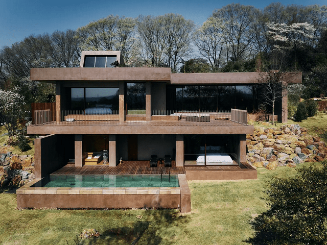 3階建ての3LDKには、3つのベッドルームのほか、インフィニティプールや温泉、サウナや洞窟のような水風呂、大人数で過ごせるリビングダイニングなどの設備を備えている。ペット専用プールなど、ペットフレンドリーな設計も特徴。宿泊人数は6人まで。空や緑と繋がる自然と調和した建築で、気持ちが整う時間を過ごすことができる。