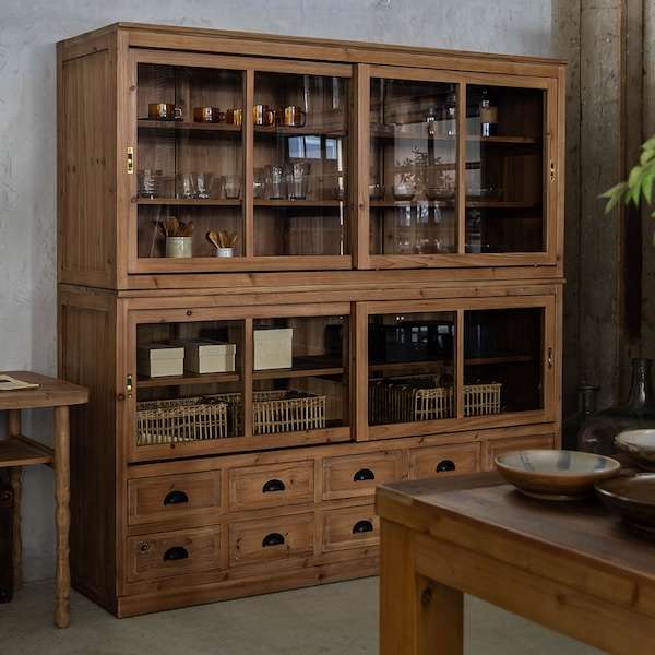 杉古材を古色塗装で仕上げ、大きなガラス引戸、アンティーク調金具をあしらった。