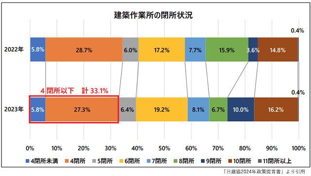 【提言3】では、民間工事における著しく短い工期による請負契約締結を禁止し、適正な工期を確保しない発注者への調査や指導を実施すること、民間建設工事標準請負契約約款(民間約款)の利用を建設業法上の努力義務とすることを要望。現状として、民間建築工事作業所の33.1%は4週4閉所以下の工程で稼働し、適正な工期が確保できていないと訴えている。