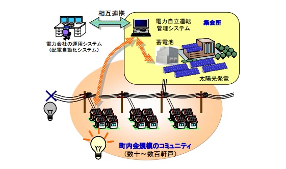 新システムでは、地震や台風で停電が起きた場合に、電力会社の運用システムと連携して周辺系統の安全性や停電の予想時間を判定。電力会社から自立運転許可を受けて蓄電池を起動し、周波数を安定化させたうえで、停電発生から20分以内に自立運転に自動移行する。自立運転中は蓄電池と太陽光発電を使って需給バランスを維持しながら住民に電力を供給し、余剰分は充電に。これにより、町内会規模(住宅:数十〜数百軒)の電力自立運転を1週間以上実現できるとする。