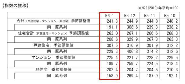 また、住宅合計・季節調整値は前月比1.6%減の263.0、戸建住宅の季節調整値は前月比3.0%減の307.5、マンションの季節調整値は前月比1.7%増の225.4、非住宅の季節調整値は前月比1.1%減の202.4だった。