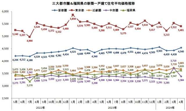 福岡県は3626万円(2.2%増)と2カ月連続上昇。分譲戸数は福岡市内の各行政区で軒並み増加し、県全体で500戸を超えた。福岡市は4234万円(0.6%増)と反転上昇した。