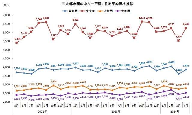 首都圏の中古一戸建ての平均価格は、前月比6.4%増の3851万円と反転上昇した。東京都は6249万円(13.1%増)と前月からの反動で大きく反転上昇。神奈川県は3958万円(2.9%減)と3カ月連続で下落し、2022年7月以来の3000万円台となった。千葉県は2788万円(6.1%増)、埼玉県は2842万円(2.7%増)といずれも反転上昇。前月の全都県下落から神奈川県を除いて上昇に転じた。