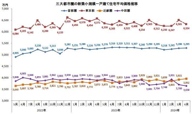 首都圏の新築小規模一戸建ての平均価格は、前月比0.2%増の5295万円と3カ月連続で上昇。上昇率は依然1%未満が続く。東京都は2.7%減の6324万円と反転下落。神奈川県は4835万円(4.7%増)と反転上昇した。横浜市・川崎市・相模原市が軒並み上昇している。千葉県は4407万円(2.4%増)と3カ月連続、埼玉県は4356万円(3.8%増)と6カ月ぶりにそれぞれ上昇した。東京都のみ下落したが、他3県が上昇したため首都圏全体では小幅ながら連続上昇となった。