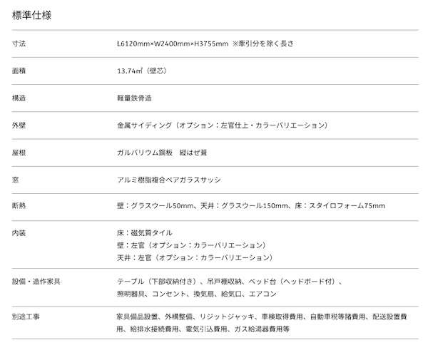 内装は床がタイル、壁・天井が左官、外装は金属サイディングが標準で、オプションで外装を左官仕上げにすることも可能。