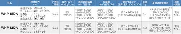 新製品の「WHP 12DA」は、従来品よりも約80%騒音を減らした68dBの静音性とコンパクトボディによる軽量化を実現。「WHP 18DA」は、低騒音+業界最速というネジ締めスピードを両立させた。