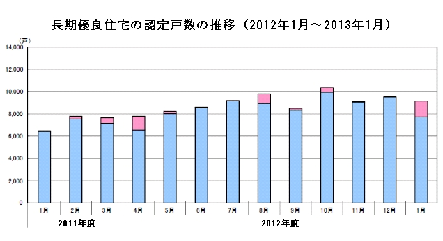 国土交通省が2月15日発表した長期優良住宅の認定戸数は、戸建て住宅が7742戸、共同住宅などが1411戸で、合計9153戸だった。共同住宅などの認定戸数が多かったこともあり、前年同月に比べ41%増えた。制度開始以来、1月としては最も多かった。