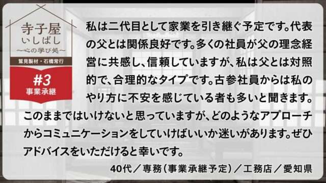 今回のご質問は、事業継承時の先代や現スタッフとのかかわりについてのお悩みですね。
