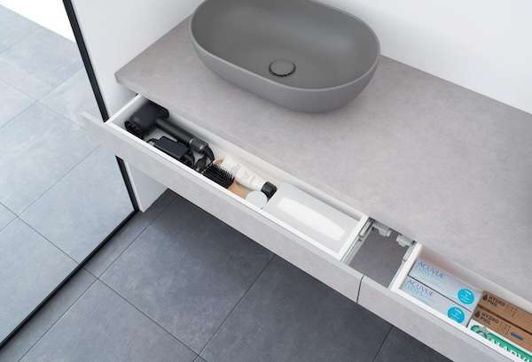 高さと奥行きに新サイズを追加したほか、要望の多かった引出し付きタイプや、台座や金具が見えない新デザインのタオルバーをラインアップした。