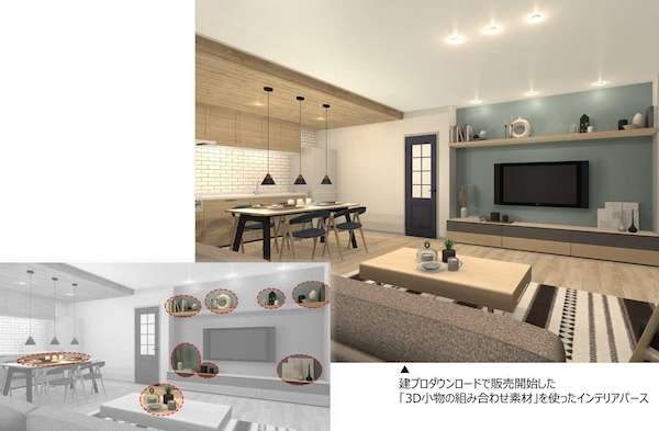 インテリアパース内のテーブルや棚、壁などに配置できるオブジェクトで、例えば4人分の食器セット、テーブルランプと置き時計、アートとアロマキャンドルなど、あらかじめ複数の小物がセットになっているため、1つ1つを選ぶ手間、配置に悩む時間を削減する。