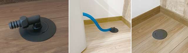 オフシーズンは、コンセントを外した部分に専用のフタパーツをはめれば床面をフラットに戻せる。市販の連続排水機能付き除湿機(ホース内径2~15mm)にも対応する。