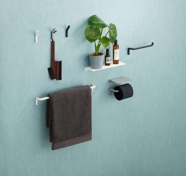 タオルバー、タオルリング、ペーパーホルダー、トレイなどをラインアップ。 ペーパーホルダーとトレイを組み合わせてトレイ付きのダブルペーパーホルダーにする、トレイの2段使いで収納スペースを増やす、など組み合わせ次第でさまざまな使い方ができる。