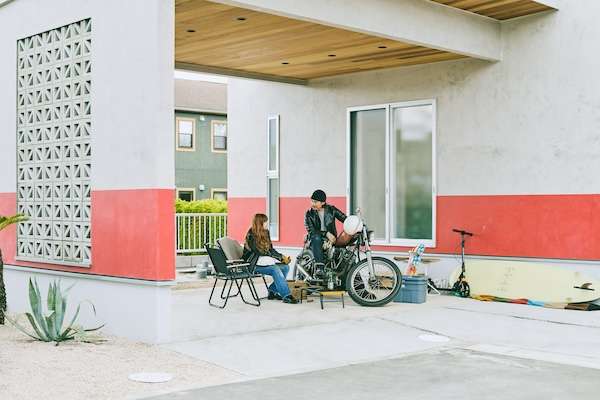 もう1つのリビングとして使えるバルコニー、車・バイク好きの心を満たすガレージも設けている。