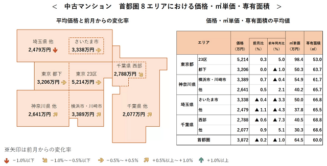 首都圏全体の1戸あたりの平均価格は、前月比0.2%減の3872万円と2カ月連続で下落した。全8エリアのうち3エリアが前月比マイナスとなったが、東京23区・神奈川県他は2017年1月以降最高額を更新。エリアによって価格動向に違いが見られた。前年同月比は1.0%減と6カ月連続で下落した。